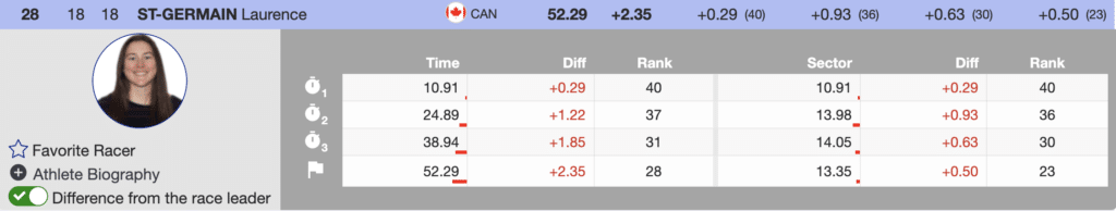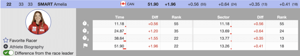 The next North American to ski was Canadian Amelia Smart who continues to show consistent form. She ends the morning run ranked 22nd (+1.96). Her teammate, Arianne Forget, skied her first World Cup slalom run but missed qualifying for the second run.