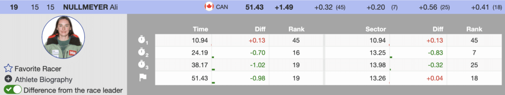 Two Canadians followed her, with Ali Nullmeyer leading the charge. Crossing the line (+1.49) slower than Shiffrin, she secured the 19th position after the morning run. Meanwhile, her teammate, reigning World Champion Laurence ST-Germain, is battling for a spot in the World Cup finals, finishing (+2.35) behind and currently holding the 28th first run rank.
