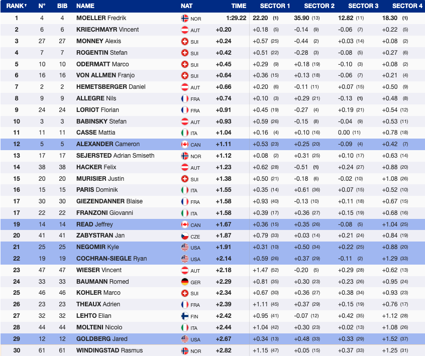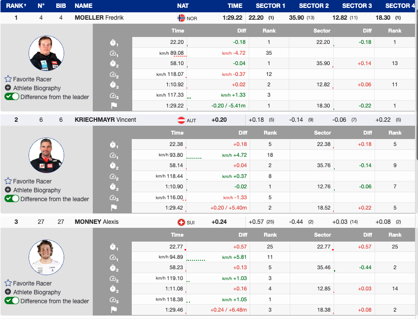 Wearing bib 27, he radiated confidence and power, attacking each panel. He held onto an impressive line and continued accelerating, finding speed through the final gates. He finished merely +0.04 behind Kriechmayr, trailing Moeller by +0.24.