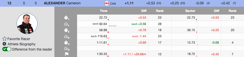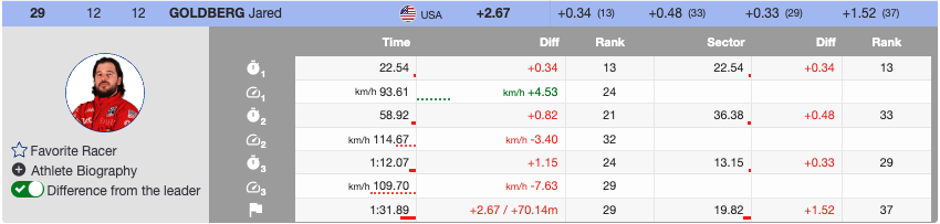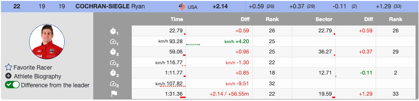 His teammate, Kyle Negomir, skied very similarly and finished in 21st place.