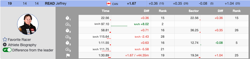 Although he was late and low, Alpine Canada Alpin athlete Jeffrey Read held on. He finished as the second-fastest North American on the Stelvio super-G track, concluding in 19th place.