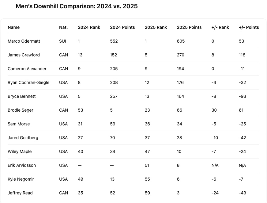 Interestingly, the top four North American men in the downhill standings were the same both seasons—Crawford, Alexander, Cochran-Siegle, and Bennett—but their order changed. Crawford jumped from fourth among them in 2024 to lead the group this season, while Bennett fell from first to fourth. Alexander held steady in second, while Cochran-Siegle remained a consistent third in both points and performance.