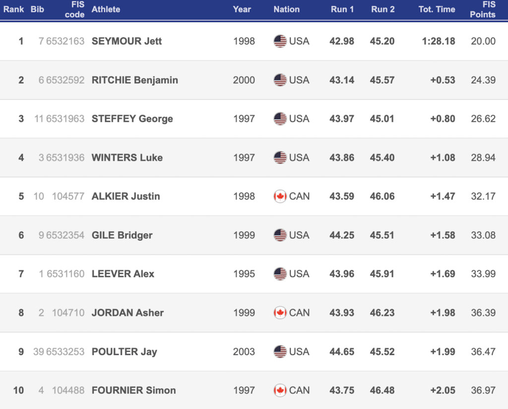 On the men’s side, USST member Jett Seymour won by 0.53 with a time of 1:28.18. His teammate, Ben Ritchie, was behind him in second and George Steffey snagged third place, 0.80 seconds back from Seymour. Jay Poulter, who also skis for the USST, moved from bib 39 to ninth place.