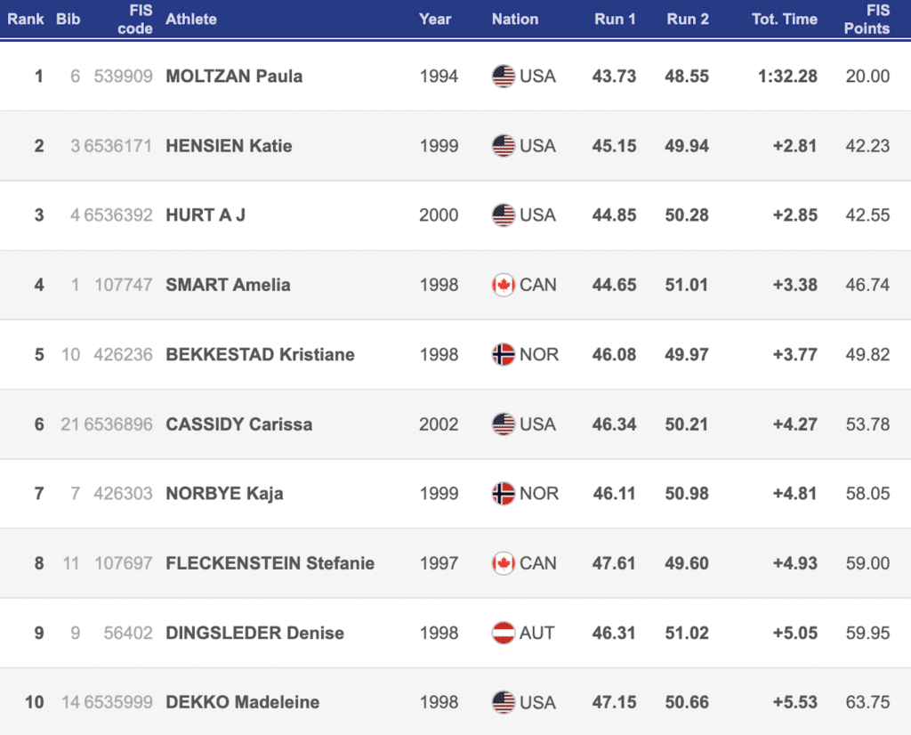Canadian skier Cassidy Gray also finished significantly better than her bib, finishing just 0.29 seconds outside of the top 10 from bib 42. She broke into the middle of the flip with the 15th fastest first run and used that momentum to earn an eighth place finish on the second for 11th place overall.