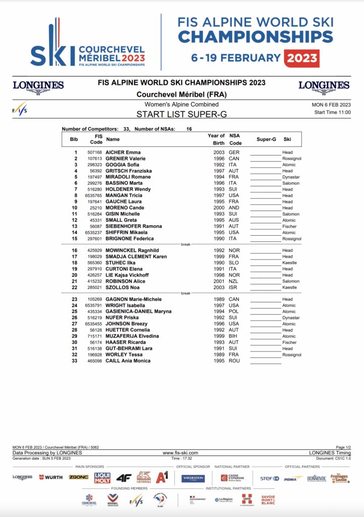 The super-G will begin at 5:00 am Eastern Time and 2:00 am on the West Coast. The slalom will begin at 8:30 am Eastern Time and 5:30 am on the West Coast. Remember, a live simulcast and full replay are available with Steve Perino and Steve Schlanger announcing on Ski and Snowboard Live and Peacock.