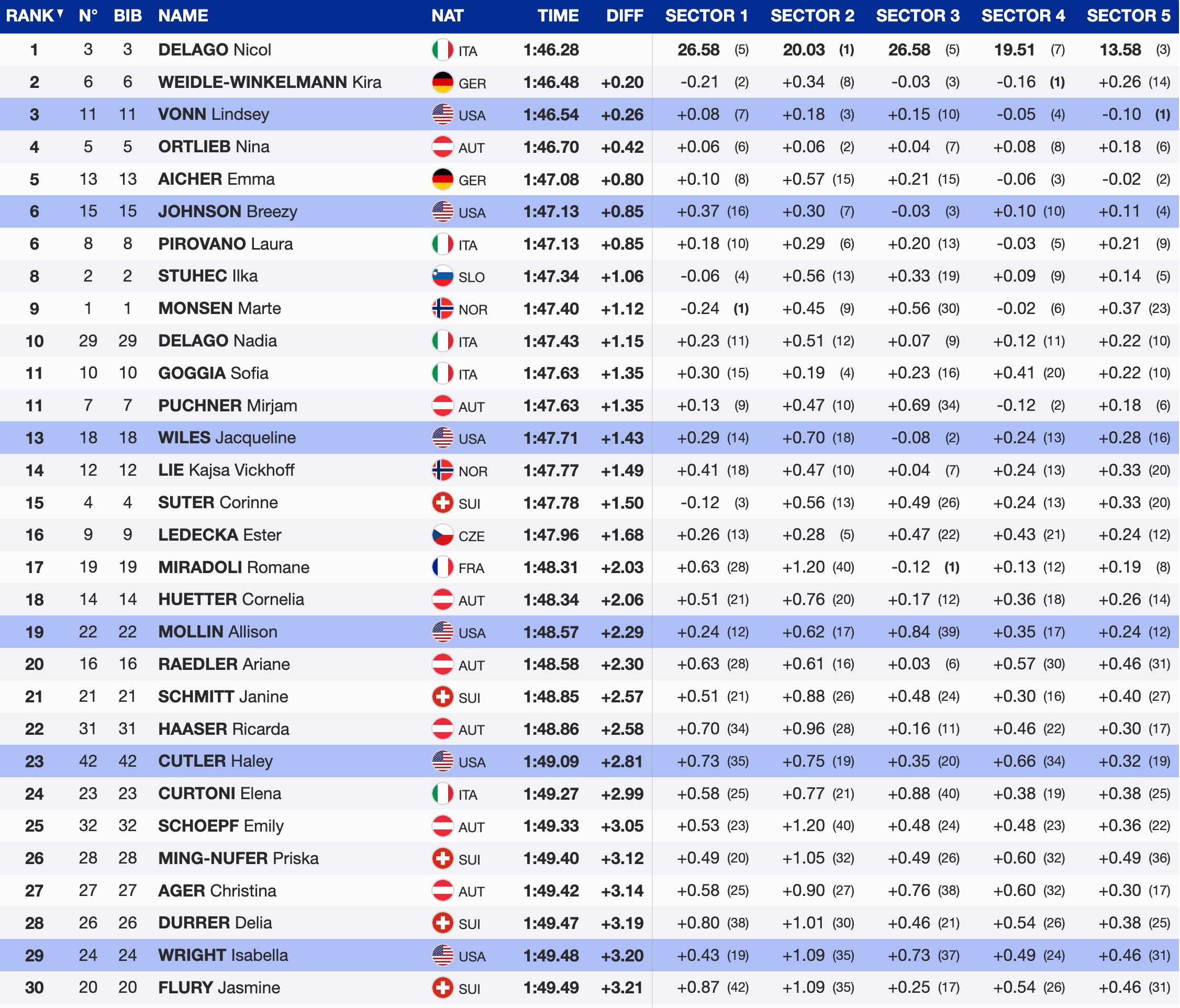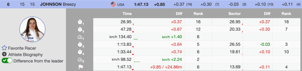Breezy Johnson leads the charge with a strong sixth-place finish, delivering a confident and aggressive run. A few small line adjustments cost her time, but her overall performance confirms she remains a major force in the speed discipline.