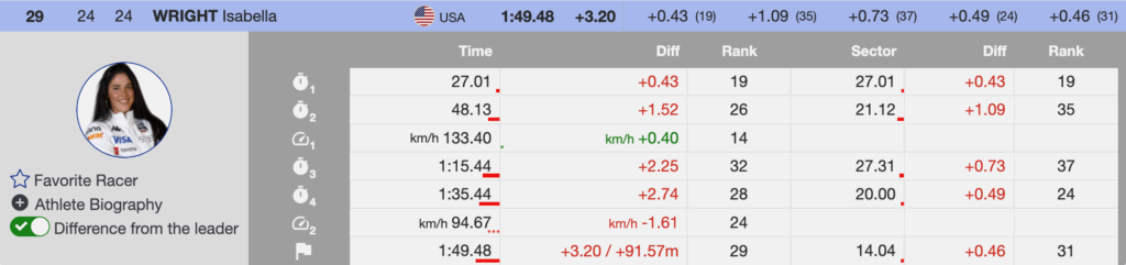 - Bib 31- Ricarda Haaser 🇦🇹- 22nd, +2.58- She delivered a courageous run after an extended start delay, waiting patiently while medical crews safely removed an injured course worker from the hill, then refocused and attacked the course with composure and commitment.