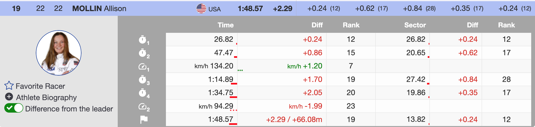 Allison Mollin continues to impress with her adaptability, finishing 19th on a track that is new to her. Her ability to produce consistent results across unfamiliar venues highlights her technical growth.