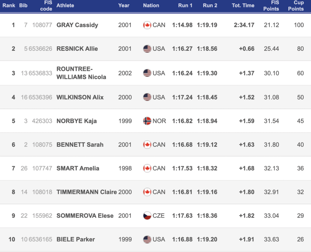 Canada’s Cassidy Gray landed on top of the women’s podium in the Panorama NorAm GS Wednesday. Gray finished with a time of 2:34.17. She was 0.66 seconds ahead of American Allie Resnick.