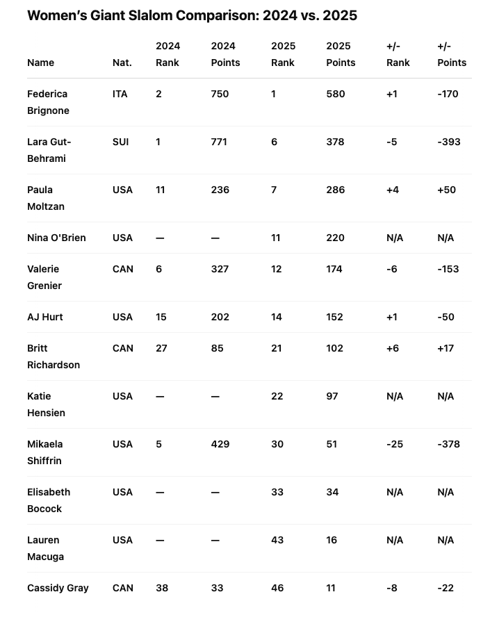 Compared to 2024, several major shifts took place in the 2025 season. In 2024, Mikaela Shiffrin led the U.S. women with 429 points and finished fifth, while Valérie Grenier scored 327 points and ranked sixth. This season, Moltzan (286) and O’Brien (220) stepped up in Shiffrin’s absence, and Richardson and Hensien climbed into the top 25.