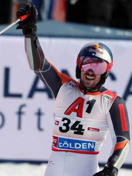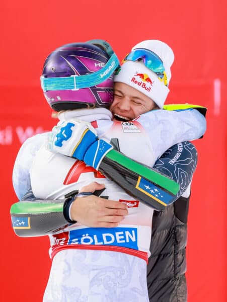 With three racers remaining at the starting gate for the Sölden World Cup opener, Norwegian Atle Lie McGrath held the lead. His teammate Henrik Kristoffersen went first among the final three and edged into the top position by a narrow 0.01 seconds, putting two Norwegians in the lead. Croatian Filip Zubcic followed, displaying his aggressive style but couldn’t complete his run. That left only first-run leader teammate Alexander Steen Olsen at the start, with two Norwegians and Norwegian/Brazilian Lucas Pinheiro Braathen now holding the top three spots. Following a brief delay due to Zubcic’s fall, Steen Olsen delivered a strong second run to win his first World Cup GS by 0.65-seconds. Lie McGrath celebrated the victory with his teammate in the finish area.