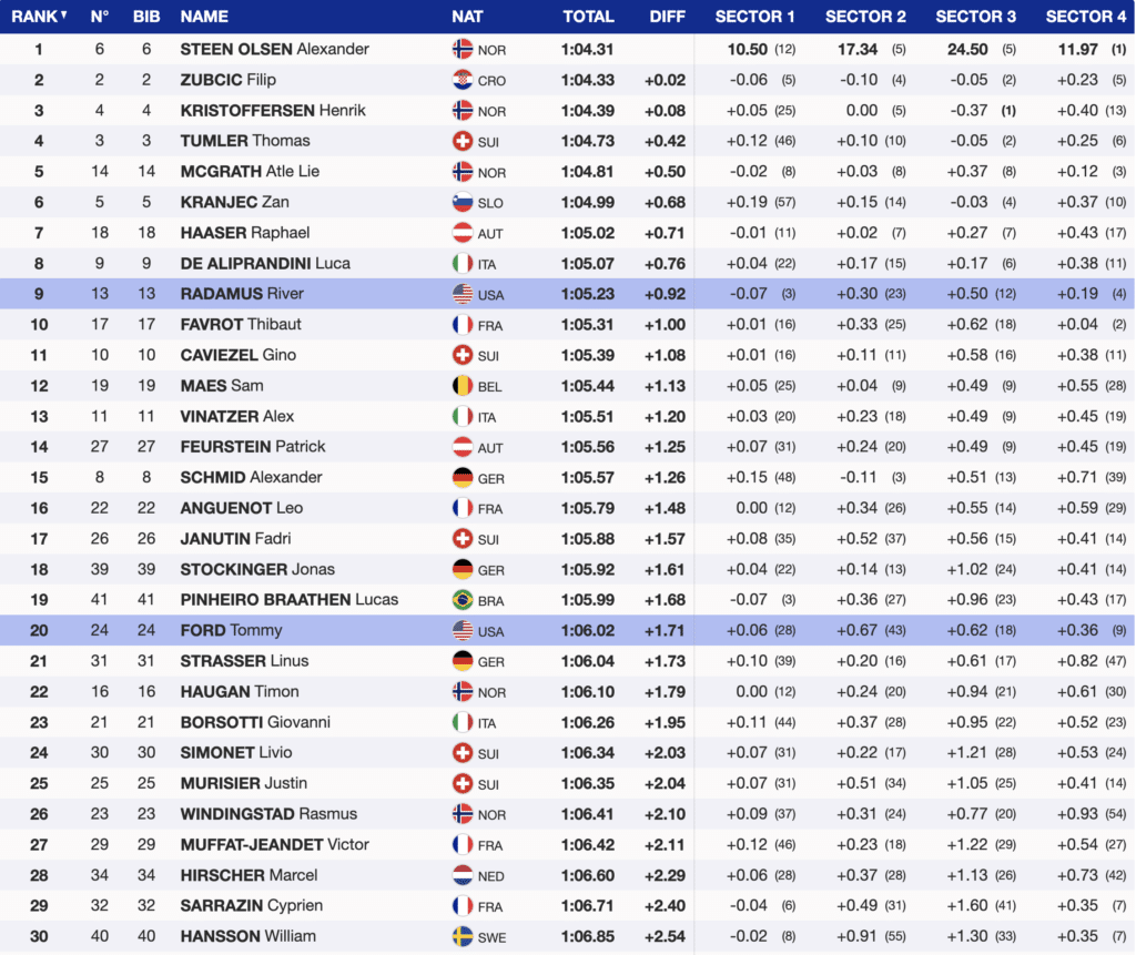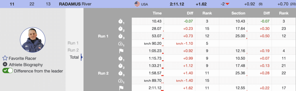 River Radamus, the last Stifel U.S. Ski Team member to take the second run, skied well but lost time to Pinheiro Braathen throughout the course, finishing fifth, 0.72 seconds behind the Brazilian leader and ending the day in 11th place.