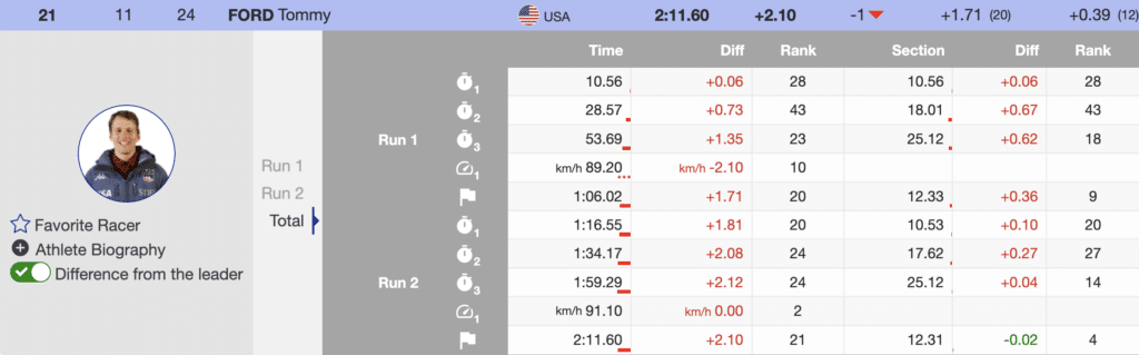 Tommy Ford was the first Stifel U.S. Ski Team member to tackle the second run. He skied well but struggled to maintain precision on the pitch, crossing into sixth and ultimately placing 21st for the day. Immediately after Ford, Pinheiro Braathen returned after a season away, showing little rust as he crossed the finish line 0.83 seconds ahead of his former Norwegian teammate Haugen. He celebrated with a joyful dance in the finish area, recalling his first World Cup victory in Sölden back in 2020.
