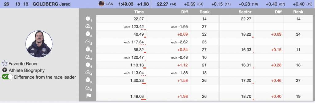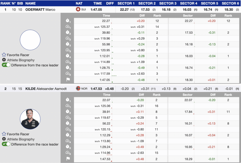 Bib one was Italian Florian Schieder. He delivered a run that proved hard to beat. However, when bib ten, Odermatt crossed (-1.09) faster, it became apparent it was possible to ski the course much faster than Schieder. After 14 skiers, Odermatt’s advantage remained more than a second. However, bib 15 was the World Cup downhill leader, Norwegian Aleksander Aamodt Kilde. While Kilde skied to a (-0.20) advantage in the first sector, he lost time in the following four sectors and crossed the finish line in second place (+0.48).