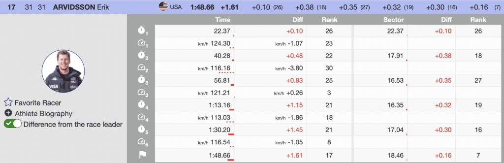 The L’Eclipse slope continues to challenge the Stiflel US Alpine Team. Today the fastest US racer was bib 31 Erik Arvidsson, who finished in 17th. Arvidsson was only (+0.08) outside the top 15. While no World Cup points are awarded in a World Championships, the top 15 do earn full World Cup Start List points.
