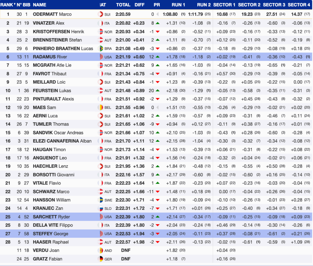 Switzerland’s 22-year-old Lenz Haechler earned his first World Cup points of his career. He opened the run with aggression, then eased slightly near the bottom and skied smart to secure 19th place.