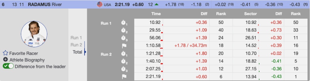 “Up until this run just now, I felt like I have not had a good run of GS this year, at least to the level that I think I am capable of, so it has been frustrating knowing that I can ski faster than I am. I wanted to put one together and I finally feel like I did that,” Radamus stated.