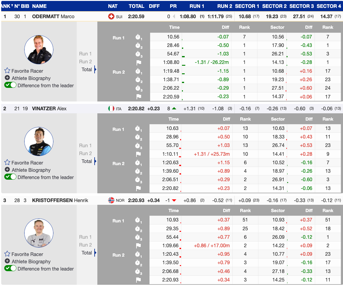 “The second run was very tough. The visibility got bad again, the track wasn’t as clean, and with the last bib you just have to fight. I tried to stay on the line and bring the power into my skiing,” Odermatt said.