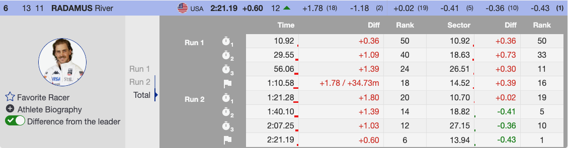 “Up until this run just now, I felt like I have not had a good run of GS this year, at least to the level that I think I am capable of, so it has been frustrating knowing that I can ski faster than I am. I wanted to put one together and I finally feel like I did that,” Radamus stated.