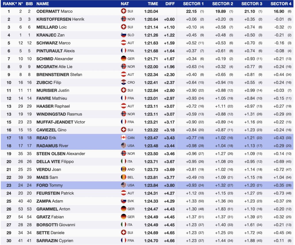 An indication that warmer weather affected the course conditions came during the first tv break at bib 15; the time spread was 3.18 seconds. Yesterday’s first-run leader Slovenian Zan Kranjec ran with bib one and sits in fourth, 1.22 seconds behind the leading Odermatt.