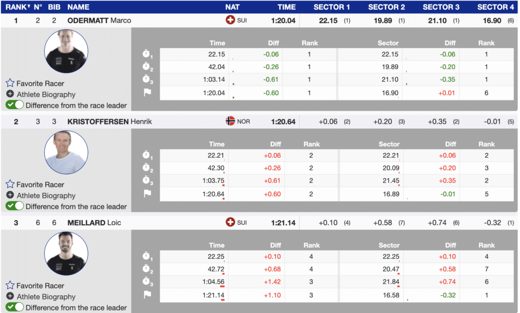 After the first 30, the spread was considerable, 15 racers were more than three seconds behind Odermatt, and six were over four seconds slower. Once skiing resumed, the times climbed even higher, and racers were finishing with times more than five seconds slower than the best time.