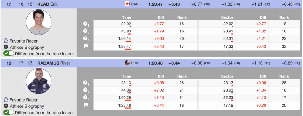 Canada’s Erik Read 3.43 seconds off the pace in 17th, leads three North Americans into the second run. USA’s River Radamus joins him in 18th place, and Tommy Ford sits in 24th.