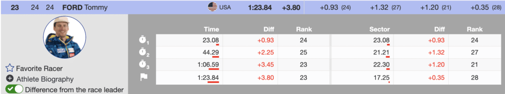 Notably, in the season-opening Sölden race, Ford used an early second-run start position to move into sixth place. Look for Ford to provide more excitement today. After he finishes, he likes a long rest in the leader’s chair, watching the second run.