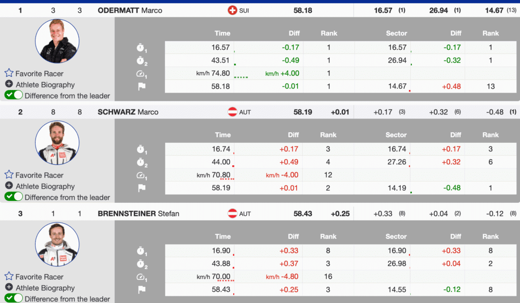 The second run at Sölden will be set by Swiss coach Renzo Valsecchi, adding an intriguing dynamic to the afternoon session. With Marco Odermatt holding the lead, the course may play to his strengths, as Valsecchi knows the tendencies and rhythms of the Swiss team well. While the conditions remain challenging, having a familiar hand set the line could give Odermatt and his teammates a subtle advantage as they look to maintain or extend their positions in the hunt for victory.