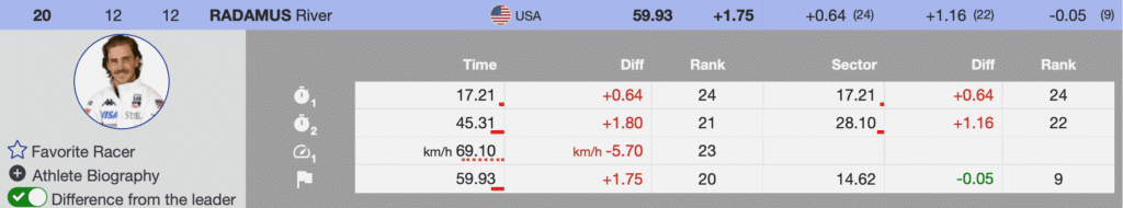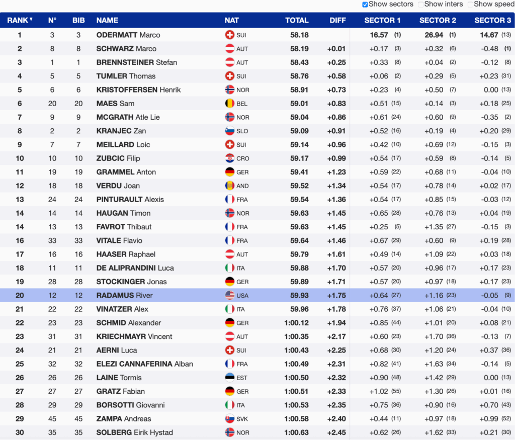 North American skiers struggled through the challenging first run, with River Radamus leading the charge. River had difficulty finding his rhythm early but managed to stay composed, positioning himself well for the second run, where he has a history of strong comebacks. As the course deteriorated and visibility remained tricky, several athletes were taken out, while the other Stifel U.S. Ski Team members starting later in the field had a hard time breaking into the top 30. Despite the tough conditions, River Radamus will be the sole North American in contention heading into the second run, as the challenging course claimed several of his teammates through DNFs or missed qualifications.
