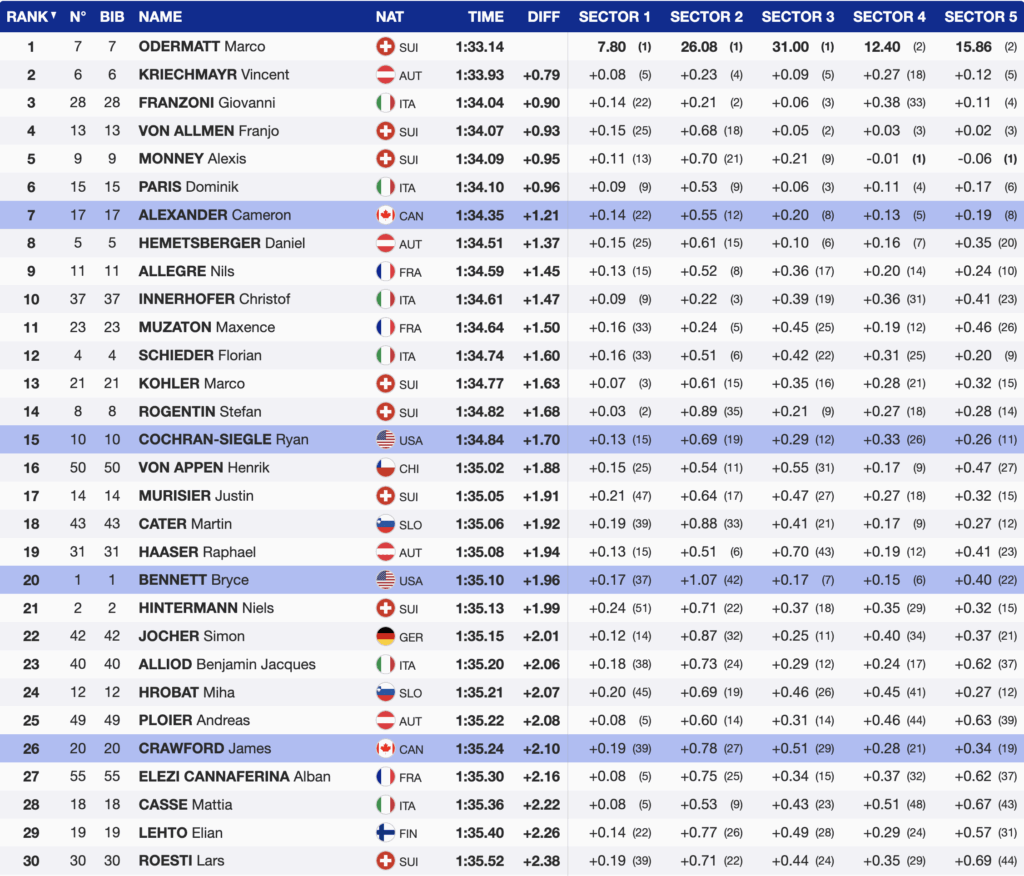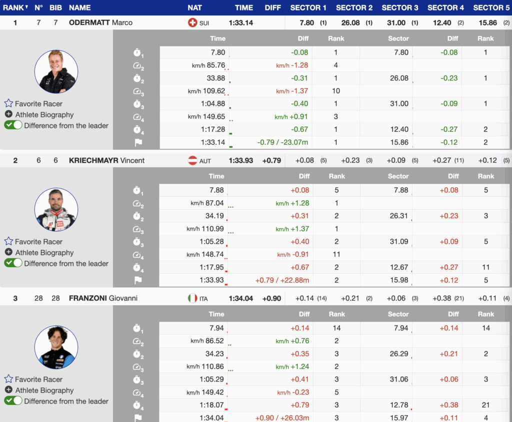 Kriechmayr skied one position ahead of Odermatt and set the pace to beat. Odermatt answered by building time through all five sectors and taking control of the race.