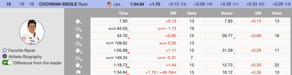 - 15th — 🇺🇸 Ryan Cochran-Siegle — 1992 — +1.70 — HEAD, Oakley