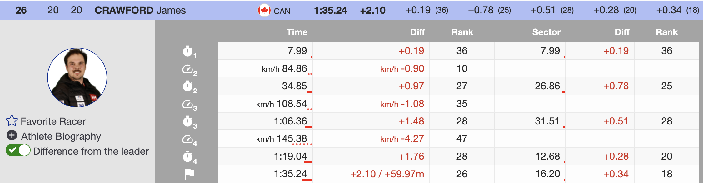 Alexander delivered his best downhill result of the season, continuing his return from last year’s season-ending injury. He backed up his only other top-10 this winter—a 10th place at Beaver Creek—with a confident run that held up well on a sprint-style Lauberhorn. - 26th — 🇨🇦 James Crawford — 1997 — +2.10 — HEAD
