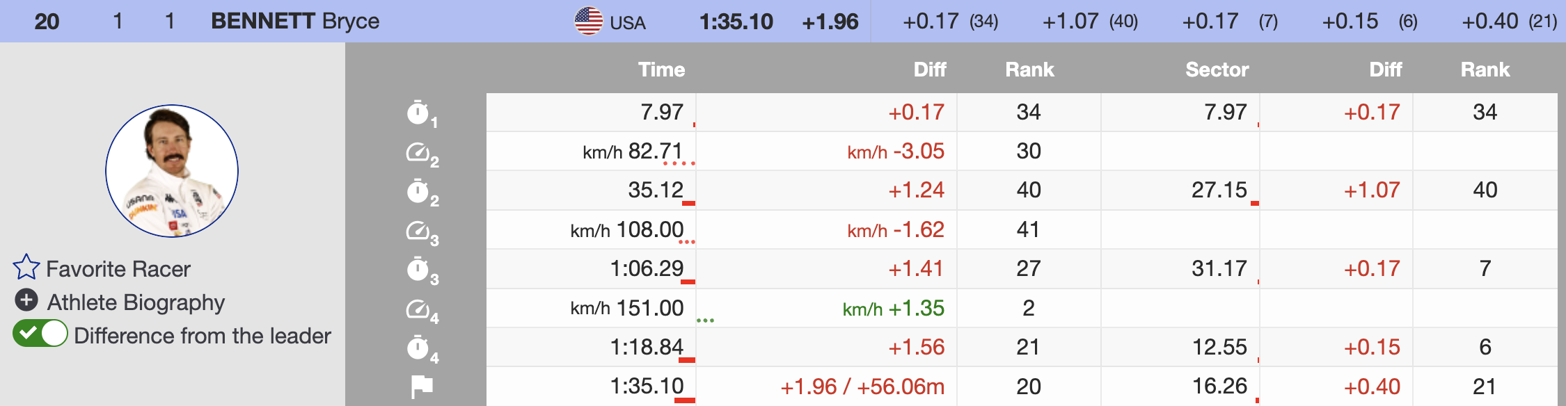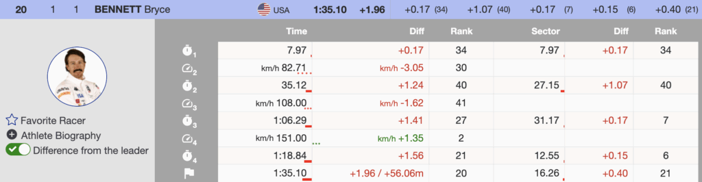 Cochran-Siegle led the Stifel U.S. Ski Team finishers. Already qualified for the Olympic team, selection pressure was not part of his equation on a shortened course. - 20th — 🇺🇸 Bryce Bennett — 1992 — +1.96 — Oakley