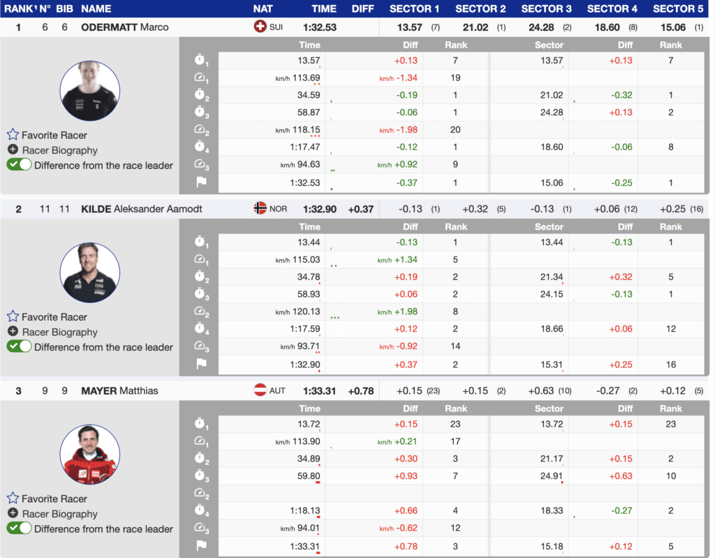 Austrian star and Olympic champion, Matthias Mayer, could not match the speed of Odermatt or Kilde, but was better than all the others and finished in third, 0.78 behind Odermatt.