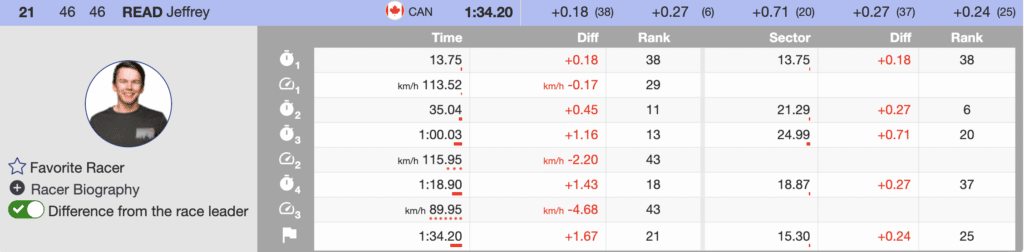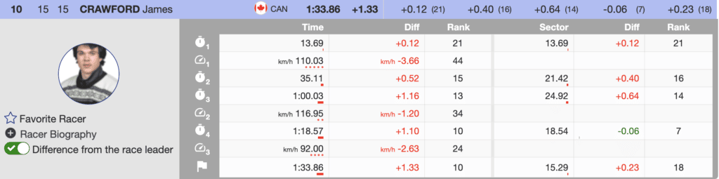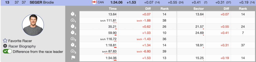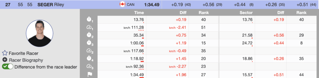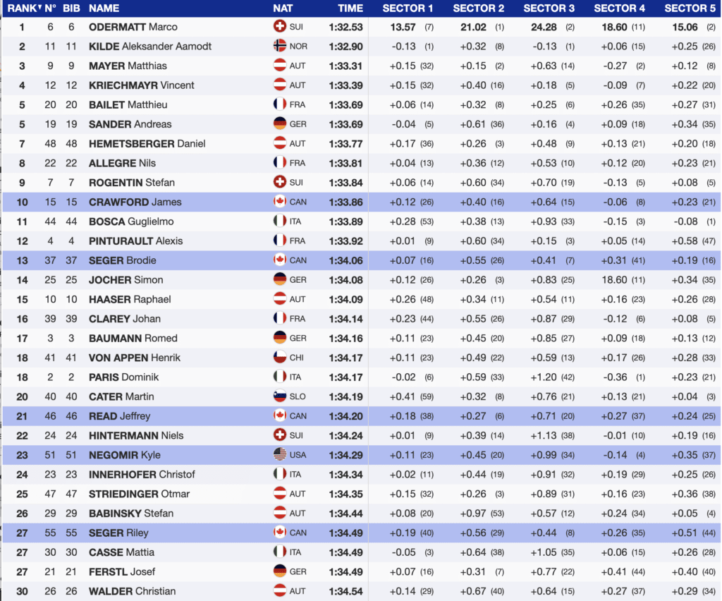 After a disappointing downhill, Canadian Jack Crawford rebounded strongly with 10th place. He was joined in the top thirty by three teammates. Brodie Seger finished just behind him in 13th. Canadian Jeff Read, bib 46, finished 21st, and his teammate Riley Seger bib 55, finished 27th. Riley will be very excited to ski in Beaver Creek next week, as he scored his only other World Cup points there last season.