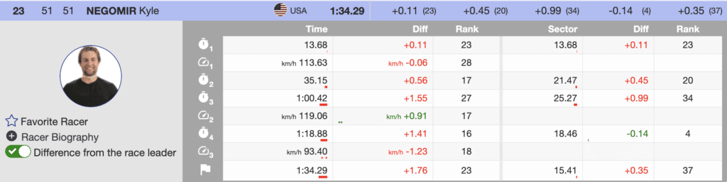 The Stifel US Alpine team had one very promising result. Kyle Negomir, who has spent most of the last two seasons recovering from injury, scored his first World Cup points. Negomir finished 23rd with bib 51. This represents a performance to be very proud of.