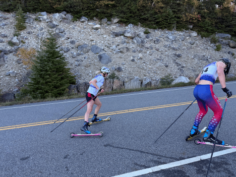 Perfect fall weather and crisp morning air greeted 76 competitors for the annual NYSEF’s Climb To The Castle rollerski race. The race was paired with The Keys to the Castle, hosted by Mount Van Hoevenberg and the Olympic Regional Development Authority and is the second stop on New England Nordic Ski Association’s (NENSA) annual rollerski series. This years’ event was headlined by the presence of the SMS T2 team, an elite training group of national team nordic athletes: Ben Ogden, Jessie Diggins, and Julia Kern. Racers from Quebec, Paul Smith’s College, The Mount Mansfield Pro Team, Middlebury College and many other regional clubs rounded out a strong field for the 18th edition of the Climb to the Castle.