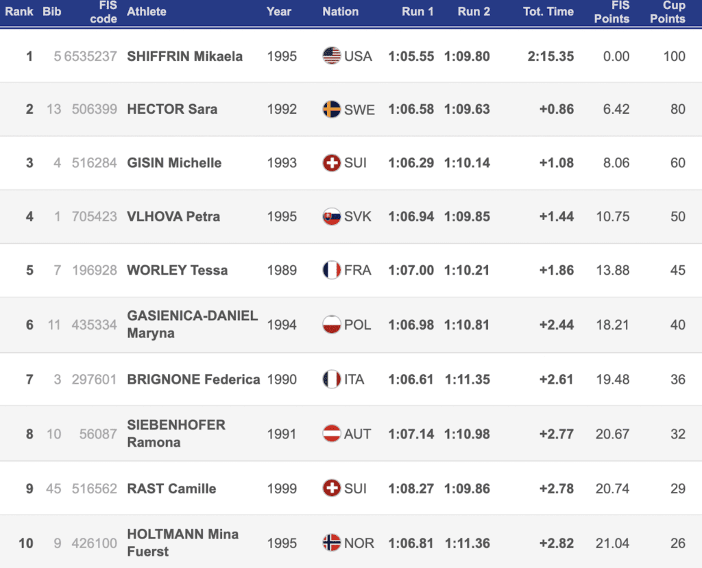 Michelle Gisin of Switzerland, who was second after the opening run, dropped to third place, 1.08 behind Shiffrin.