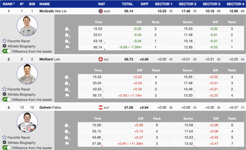 Heading into Run 2, the battle appears centered on Norway, Switzerland and Austria — with Belgium firmly in the conversation. Lie McGrath controls the race. Meillard remains close enough to apply pressure. Behind them, tenths separate the medal contenders.