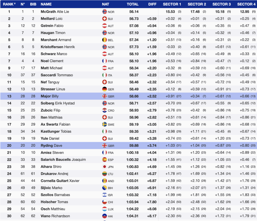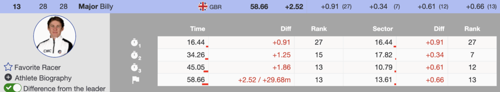 The strongest British performance came from Billy Major, who delivered a composed run to sit 13th after the opening leg. If he maintains a top-15 position after Run 2, he will earn valuable World Cup Start List points — an important boost for his future start number on the circuit.