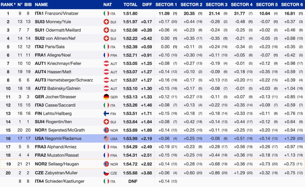 The lone American team of Kyle Negomir on the downhill and River Radamus in the slalom faced an uphill battle after an all-out run from Negomir on the Bormio track. Knowing he had to leave it all on the hill to give his team a chance, Negomir pushed aggressively from the start, committing fully to the edge and taking on significant risk in pursuit of speed. A bit inside and bounced around in the opening section, he fought to find aerodynamics through a loose and attacking run and was nearly high-siding in the middle section. Too low and late into the bottom, Negomir could not quite carry the speed needed to claw time back and was heavily compressed before the finish. He crossed the line +2.19 seconds off the pace, leaving Radamus with time to make up in the slalom but a clear sense of the effort and commitment behind the run.