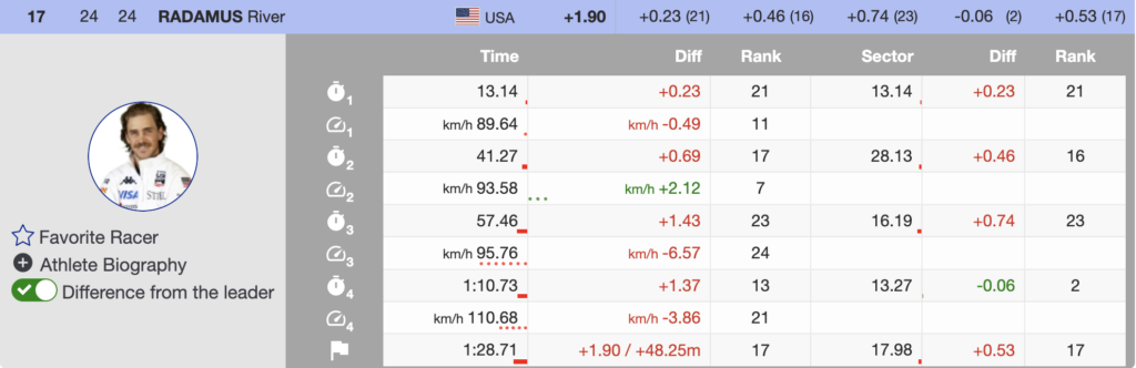 🇺🇸 River Radamus was the second and final Stifel U.S. Ski Team skier to start. Despite a strong third sector, he was unable to carry that momentum through the full run and narrowly missed the top 15, finishing 1.90 seconds back.