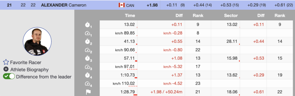 21st 🇨🇦 Cameron Alexander (CAN, Bib 22, 1997) — +1.98 (no points)