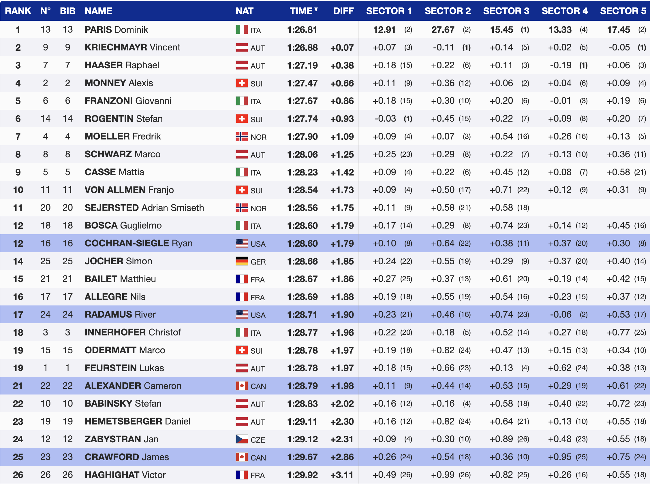 1st 🇮🇹 Dominik Paris (ITA, Bib 13, 1989, Nordica) — 1:26.81