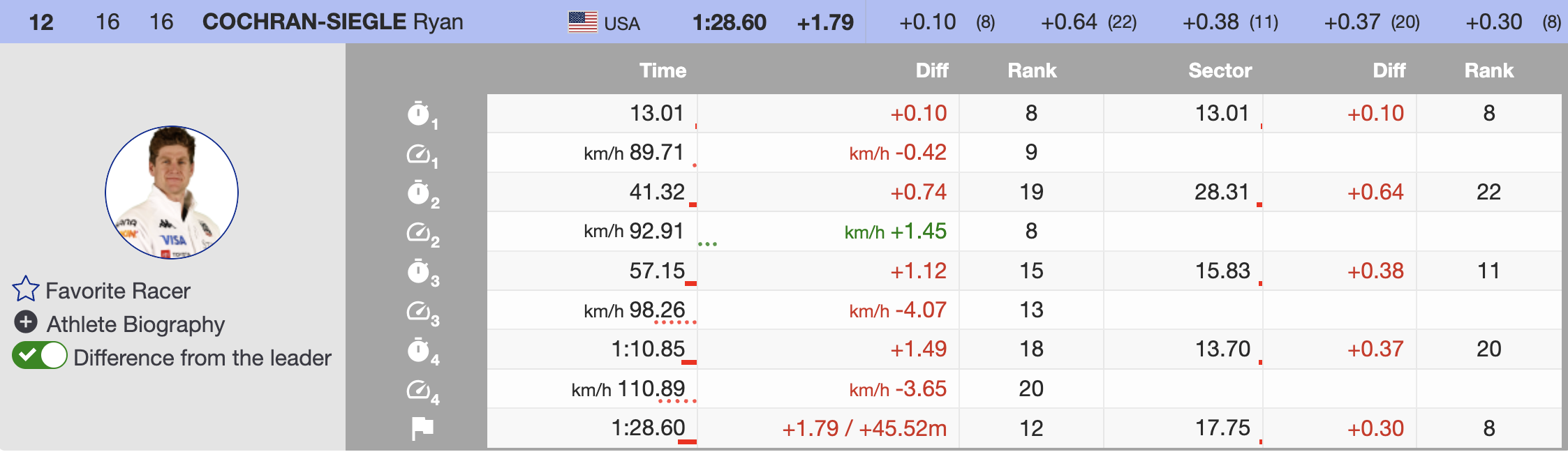 12th (T) 🇺🇸 Ryan Cochran-Siegle (USA, Bib 16, 1992, Head) — +1.79 ✅