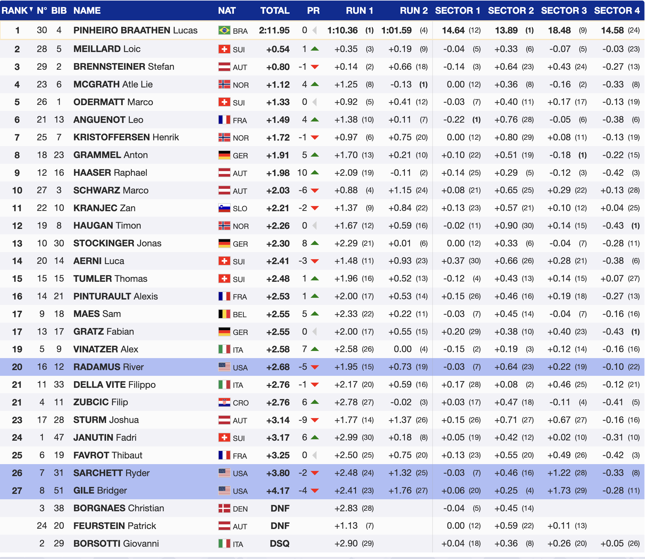 Odermatt held the lead through the early sectors but lost his margin in the third sector and finished 0.21 seconds behind McGrath, good enough for second at that point but ending his hopes of victory.