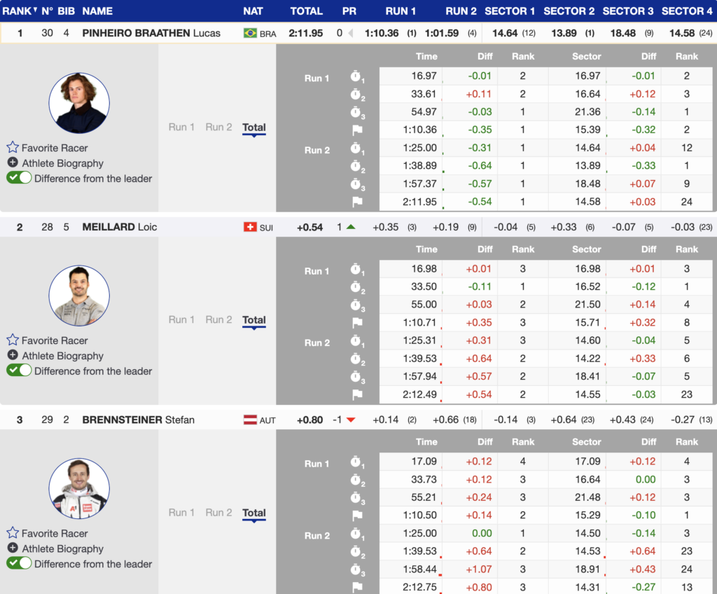 Starting with a 0.35 advantage over Meillard, the Brazilian star increased the margin early in the run. His powerful skiing through the fall-line maintained control of the race and he never gave the challengers an opportunity.