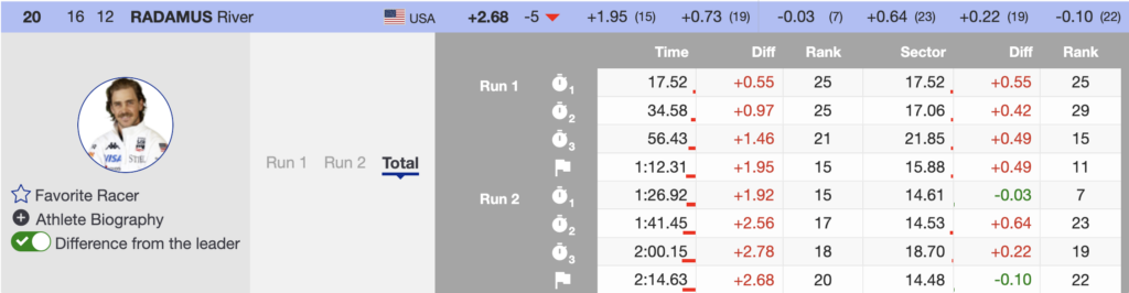 The final Stifel U.S. Ski Team skier in the race was River Radamus, who started 16th in the second run.