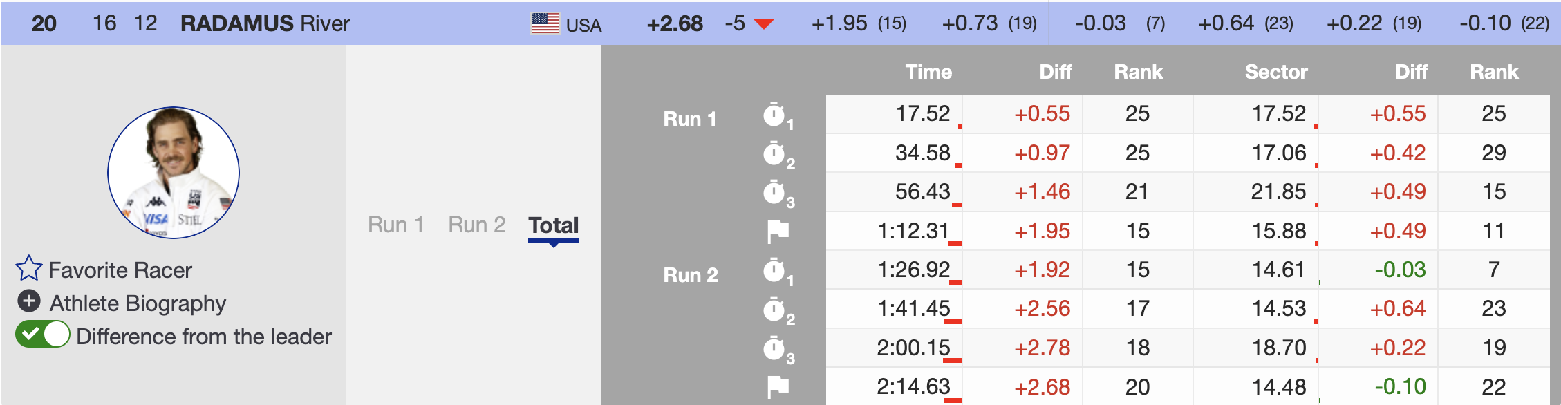 Even so, his season standing remains secure. Radamus will comfortably qualify for the World Cup Finals giant slalom in Hafjell, marking his fifth consecutive GS Finals appearance.