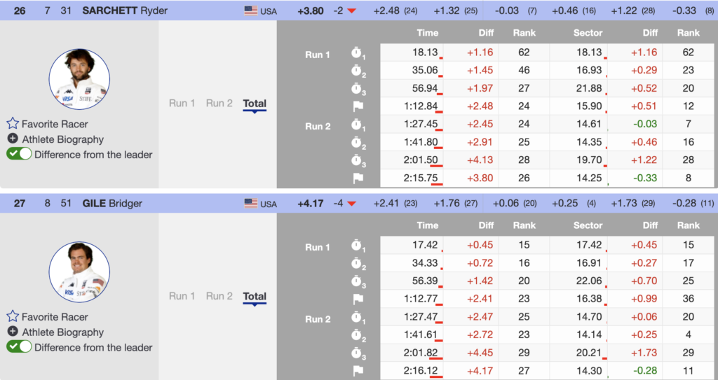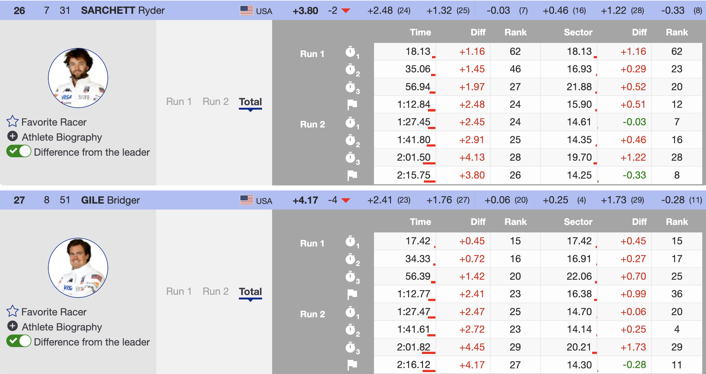 All three Americans lost time in the third sector of the second run, but scoring three athletes in the points is an encouraging result. Sarchett and Gile also close their World Cup seasons on a positive note.
